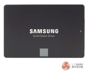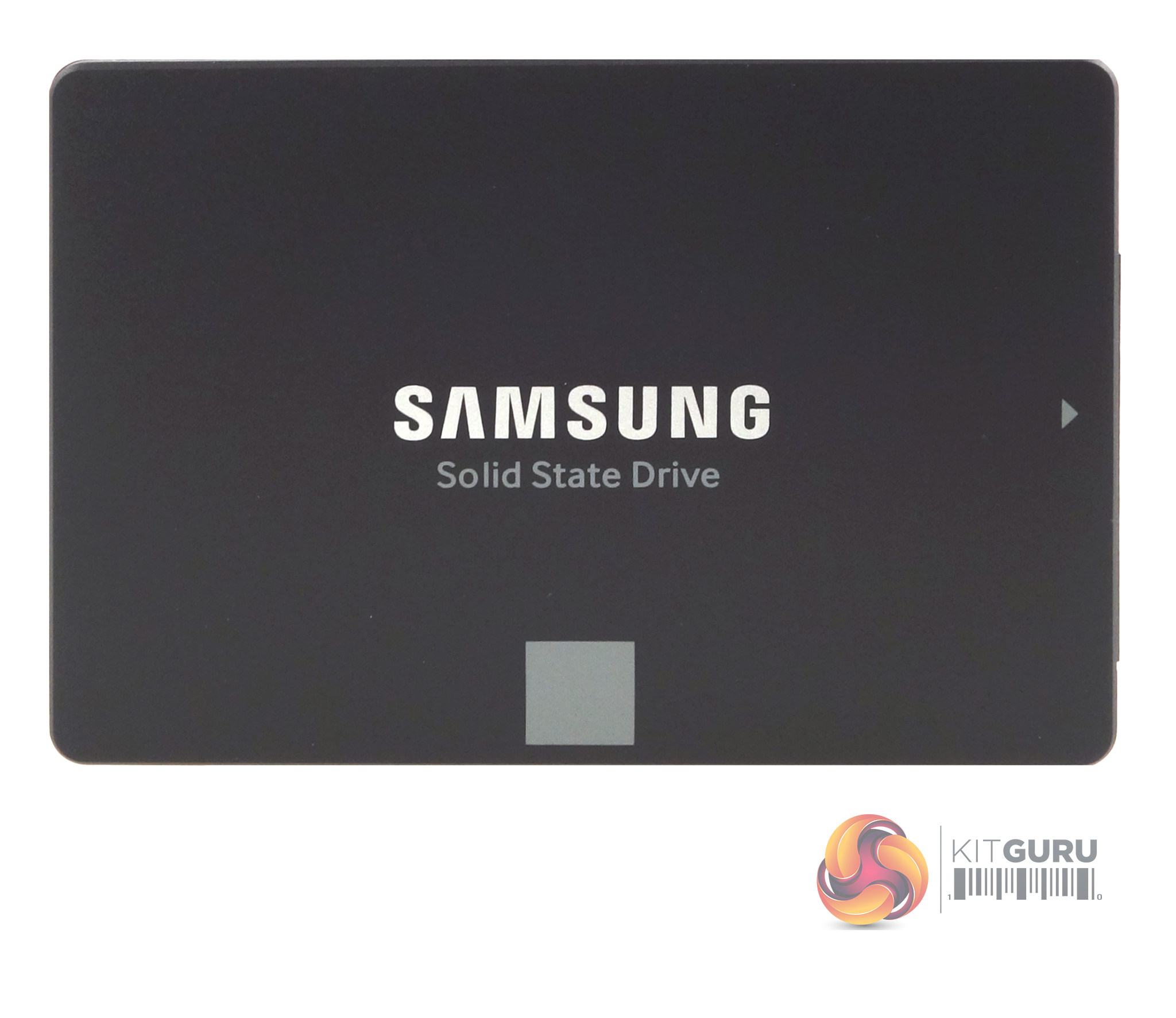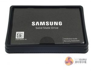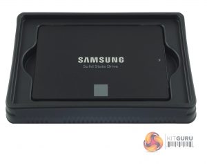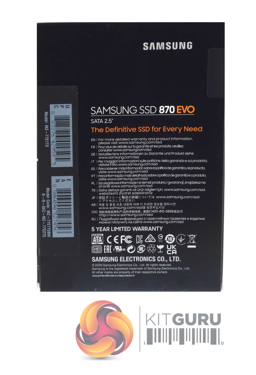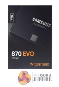 The Samsung SSD 870 EVO ships in a compact black box with an image of the drive on the front, with the Sequential read/write performance figures displayed on the bottom right-hand side. There is also a sticker on the top left of the box which indicates the capacity of the drive.