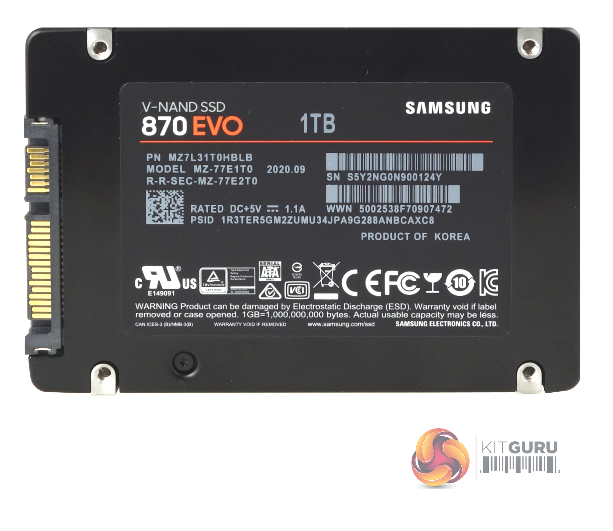 Remember the days when a 1TB drive meant a full-length PCB crammed with NAND chips. Not so the SSD 870 EVO, it has a tiny PCB, with just three major components on it; the 8-channel MKX controller (labelled S4LR059), a single 1xx layer V-NAND package (K90VGY8) and a 1GB LP-DDR4-1866 DRAM cache IC.