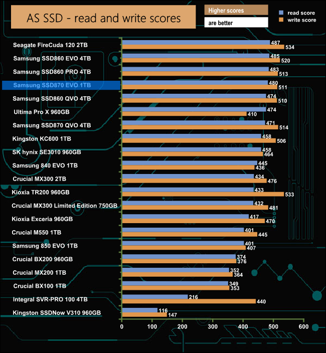 In the AS SSD benchmark, the SSD 870 EVO produced strong read and write scores of 480 and 511 respectively, good enough to put the 1TB model into the top five of drives we've tested to date.