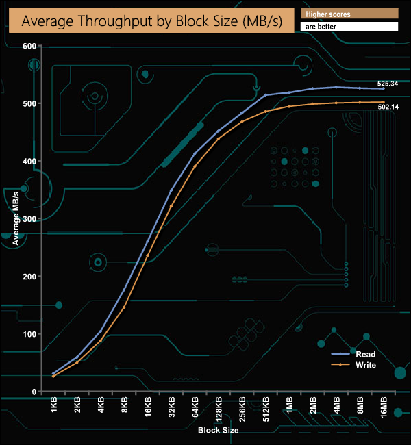 In our throughput tests, peak reads came at the 4K block mark at 527MB/s before dropping slightly finish the test run at 525.34MB/s. Writes peaked at the end of the test at 502.14MB/s, both these peak figures are a bit shy of the official 560MB/s for reads and up to 530MB/s for writes.