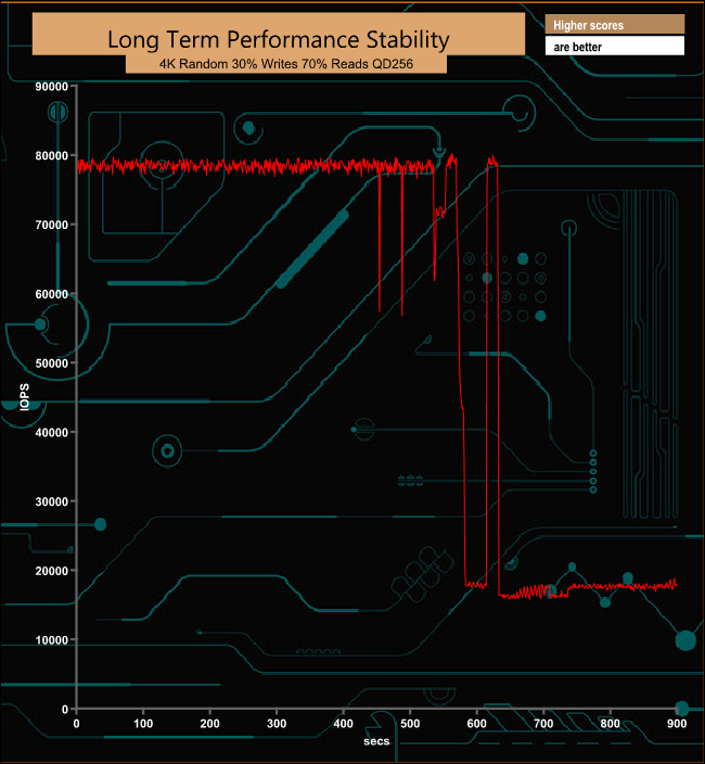 For the long term performance stability test, we set the drive up to run a 15-minute 4K random test with a 30% write, 70% read split, at a Queue Depth of 256 over the entire disk. The 1TB Samsung SSD 870 EVO averaged 54,414 IOPS for the test with a performance stability of a very useful 72%.