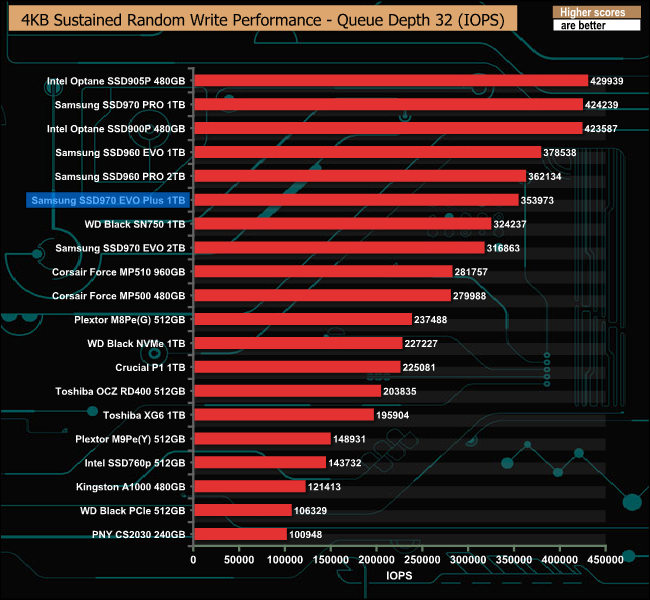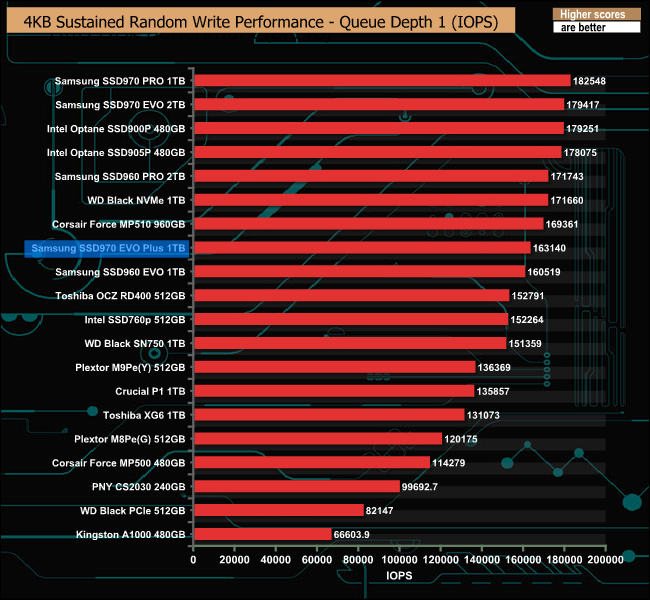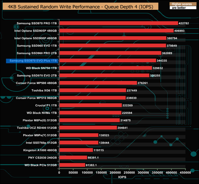 As with the 4K random read performance, Samsung quotes random write performance figures at two queue depths. At QD1 the drive is rated as up to 60,000 IOPS and at QD32, 550,000 IOPS. In our 4K testing the drive produced a QD1 figure 163,140 IOPS, much faster than the official figure. However, as with the random read test results, we fell well short of the official random write figure of 550,000 IOPS at 354,973 IOPS.