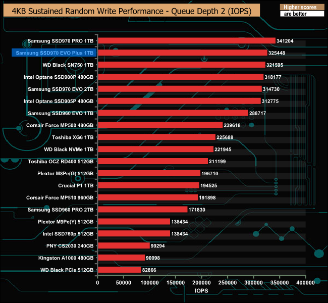 At QD1, the SSD970 EVO Plus sits someway off the 2TB SSD970 EVO, but for every other tested QD the new drive outpaces the older model.