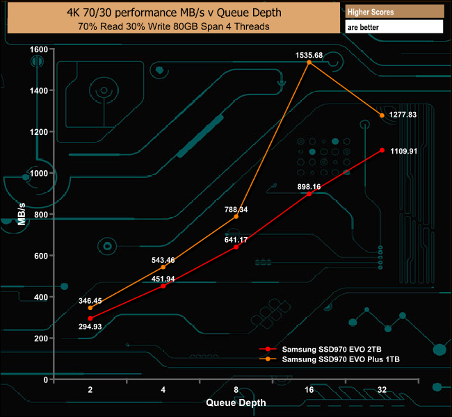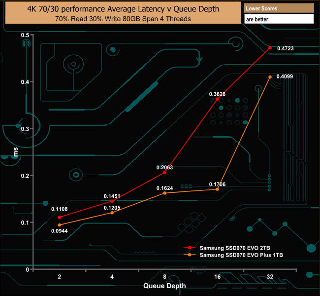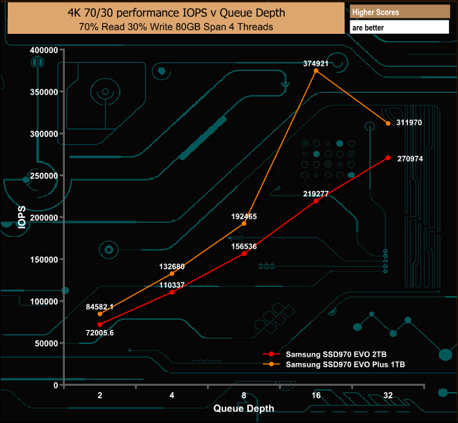 The SSD970 EVO Plus handles our 70/30 read/write mixed test better than the SSD970 EVO, with higher performance and lower latencies than the older drive. The performance of the drive SSD970 EVO Plus peaks at QD16 at 374,921 IOPS before dropping back to finish the test at QD32 at 311,970 IOPS.