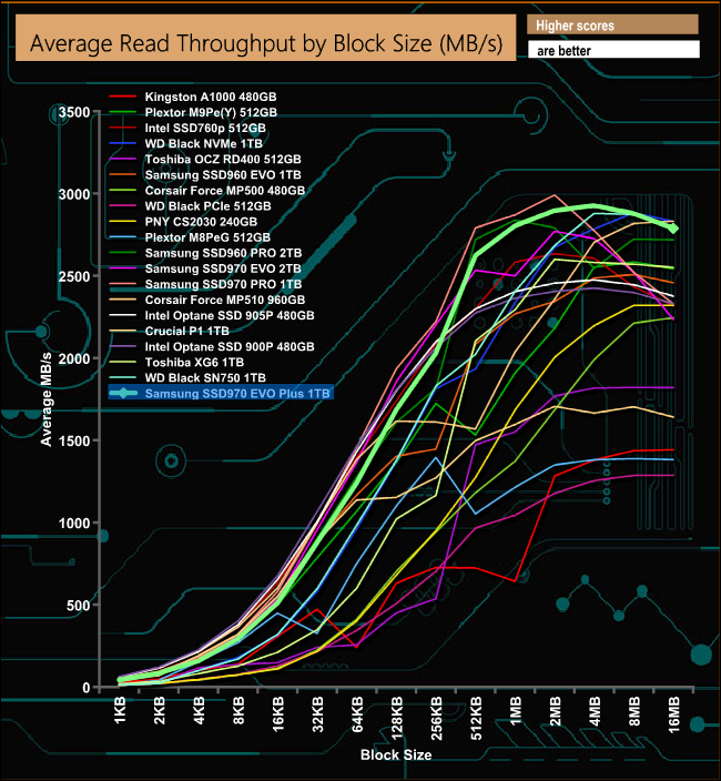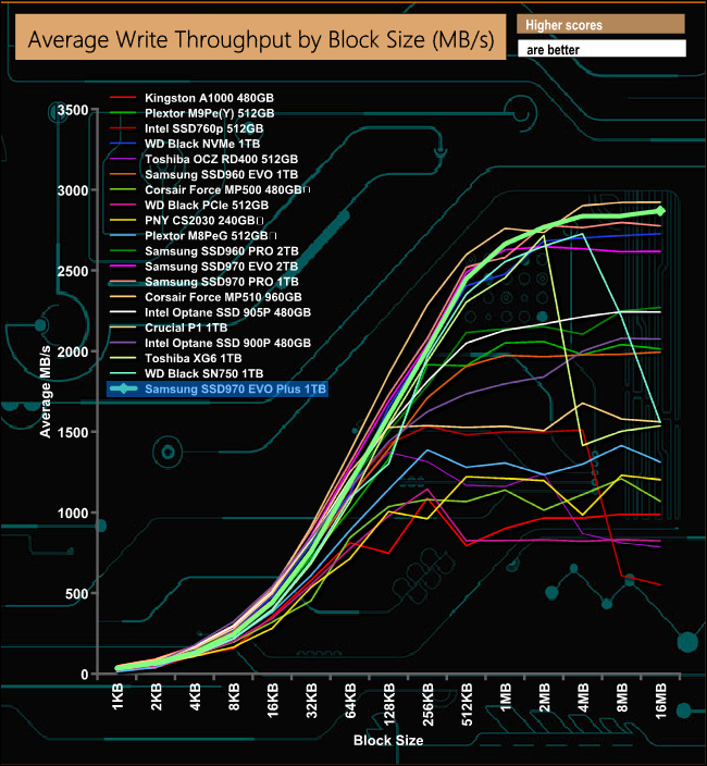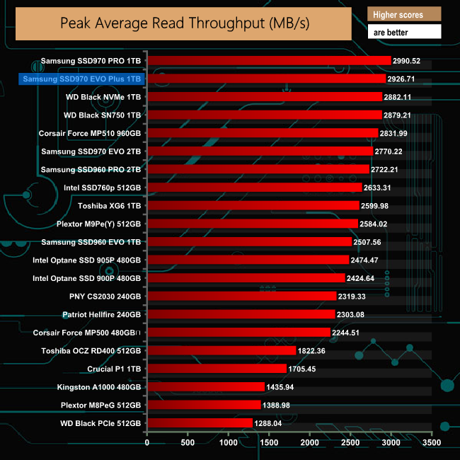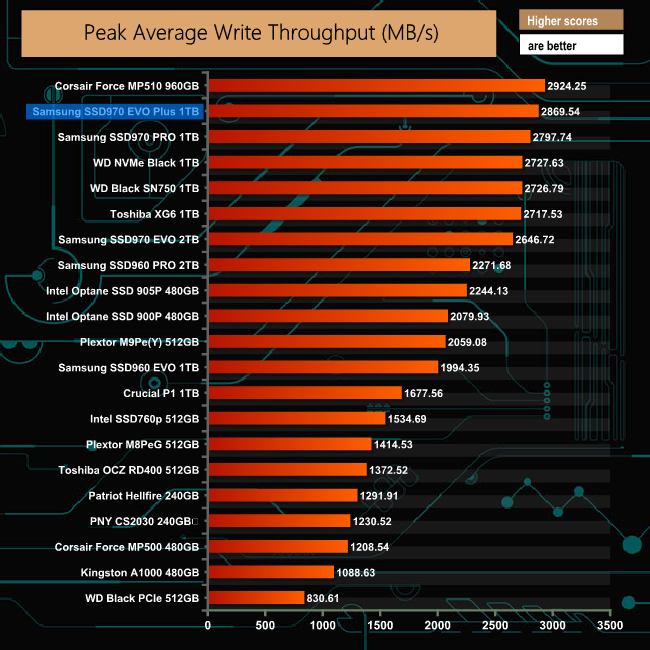 The 970 EVO Plus write throughput figure of 2,869.54MB/s is even faster than the figure we got out of the 970 PRO drive.
