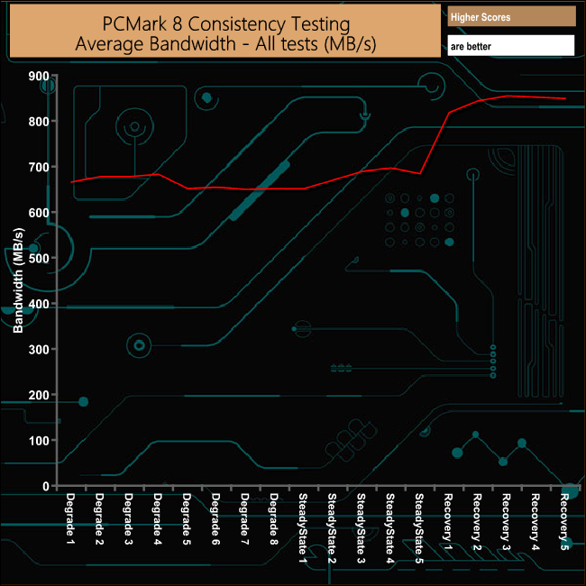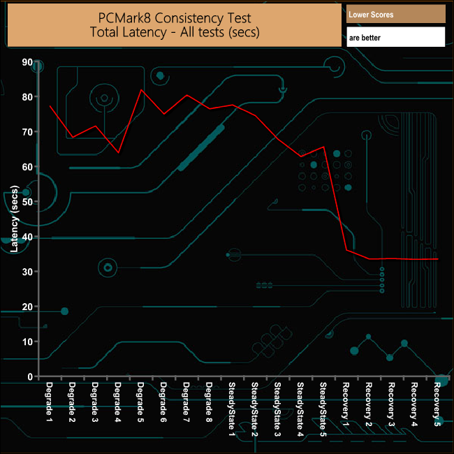 Futuremark’s PCMark 8 is a very good all round system benchmark but it’s Storage Consistency Test takes it to whole new level when testing SSD drives. It runs through four phases; Preconditioning, Degradation, Steady State, Recovery and finally Clean Up. During the Degradation, Steady State and Recovery phases it runs performance tests using the 10 software programs that form the backbone of PCMark 8; Adobe After Effects, Illustrator, InDesign, Photoshop Heavy and Photoshop Light, Microsoft Excel, PowerPoint, Word, Battlefield 3 and World of Warcraft. With some 18 phases of testing, this test can take many hours to run.
