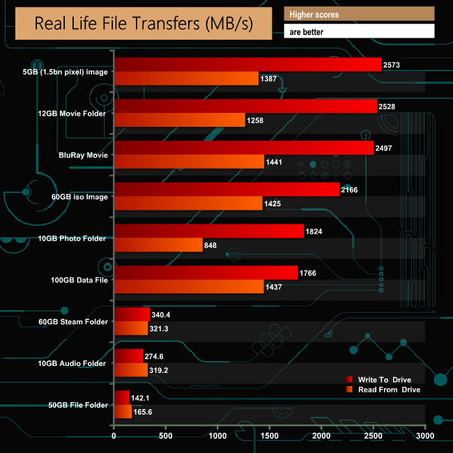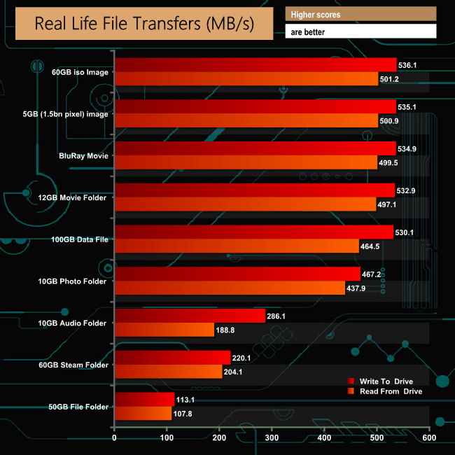 The drive handles large file sizes a lot more effectively than smaller ones, as can be seen by the 500MB/s+ figures for the tests made up of larger files (ISO image, Blu Ray movie etc).