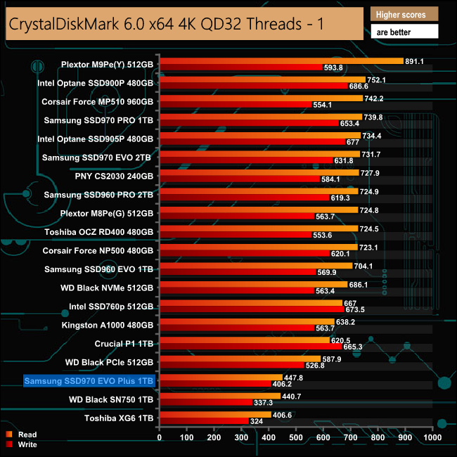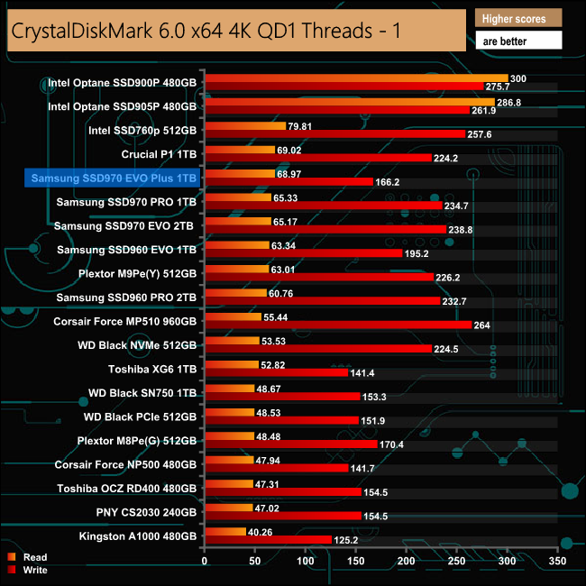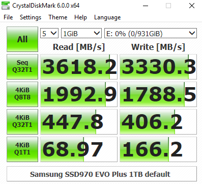 The SSD970 EVO Plus seems to struggle with the 4K QD32 test of CrystalDiskMark, falling way behind the original SSD970 EVO for both reads and writes.