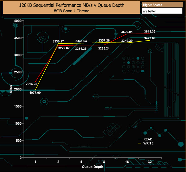 In our 128KB Sequential tests the drive produced read and write figures that both bettered the official drive ratings. The read test gave a figure of 3,618MB/s against the official 3,500MB/s while the write figure of 3,423MB/s was an improvement over the official 3,300MB/s.