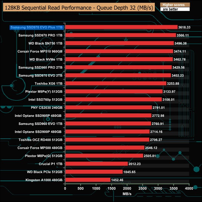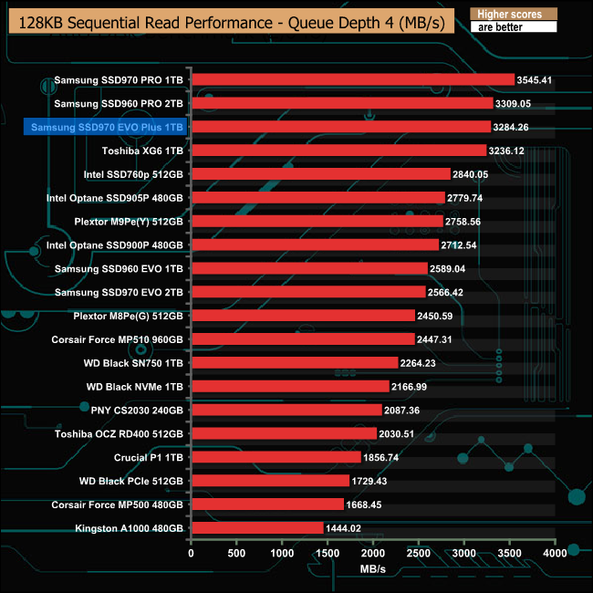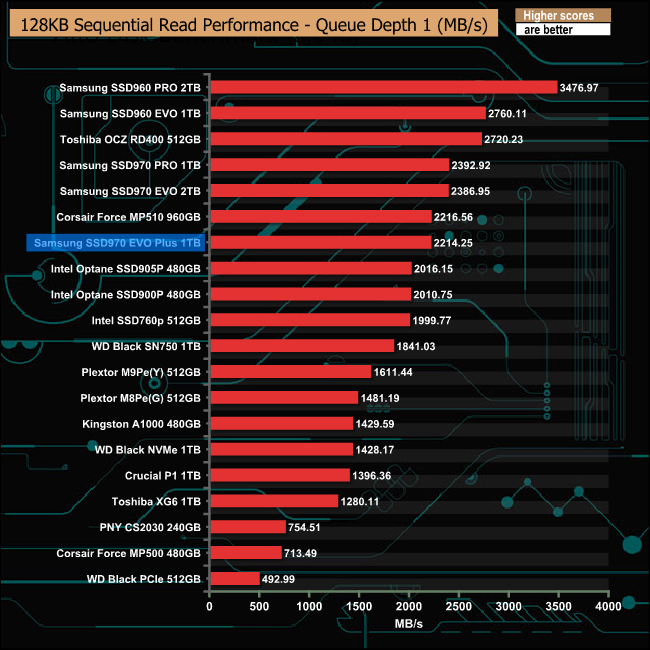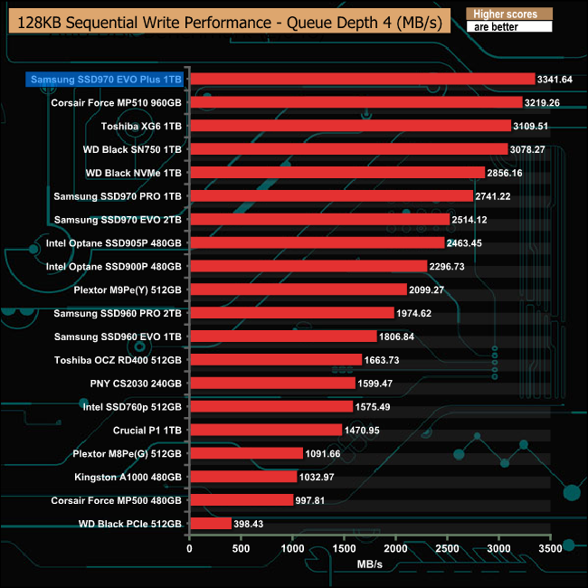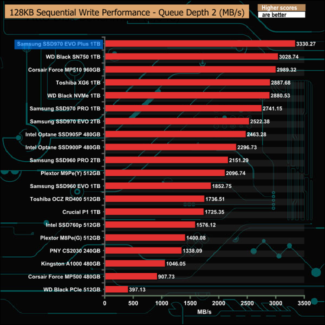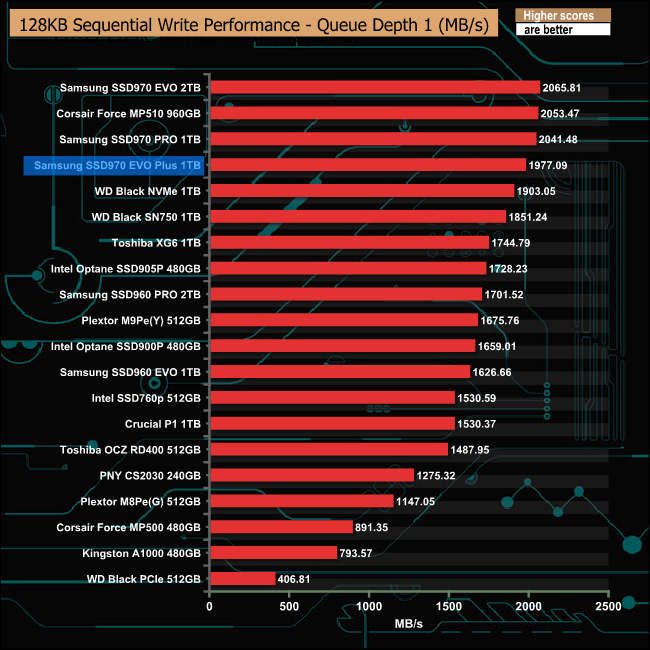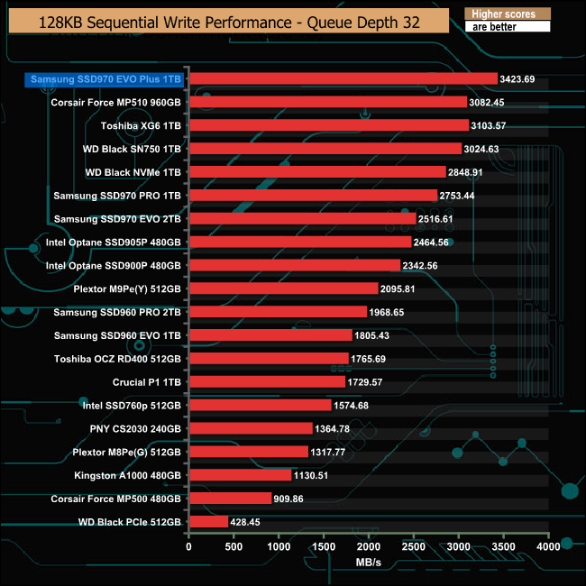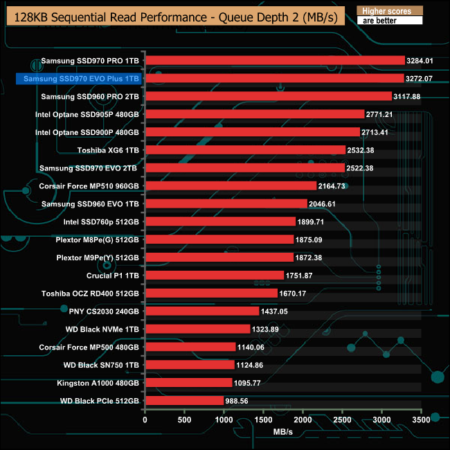 At a QD of 1, the 970 EVO Plus sits below the original 970 EVO in the Sequential read results chart, but as the queue depth deepens the new drive pulls away from the older drive until finally at a QD of 32 it sits firmly in the top spot on the chart, even beating Samsung's own mighty 970 PRO.