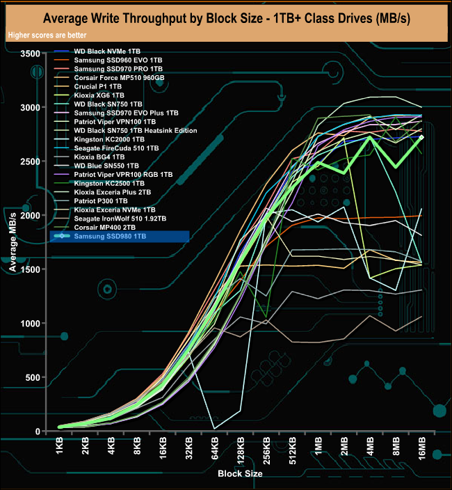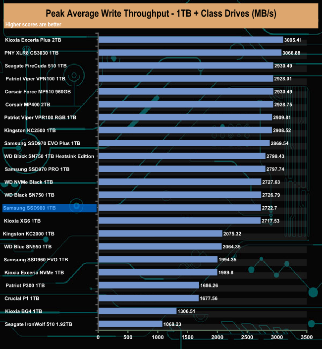 The drive's peak write figure of 2,722.70MB/s sees the drive in the bottom half of our results chart.