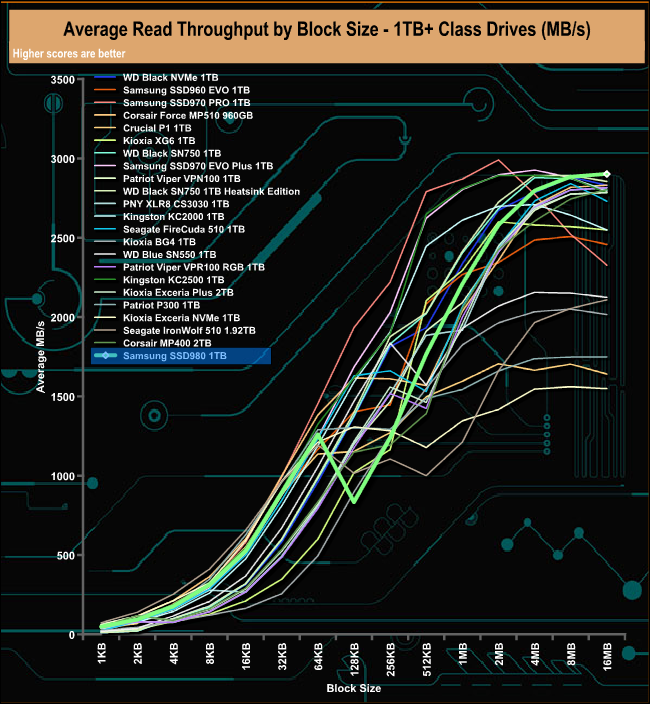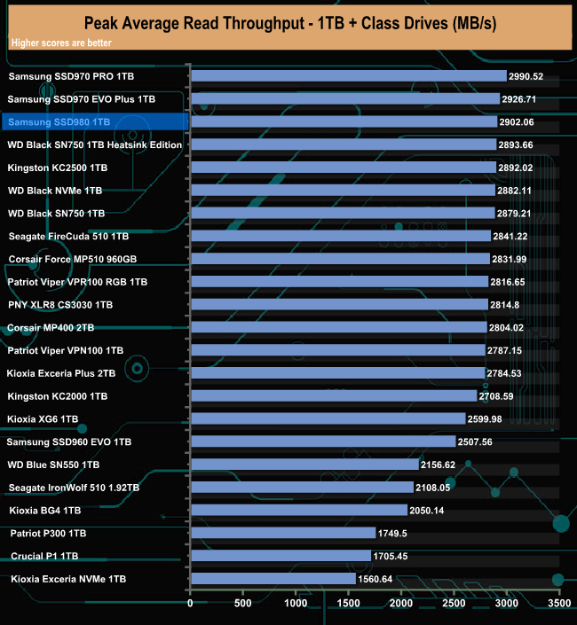 In our read throughput testing, the drive peaks at the end of the test at 2,902.06MB/s, short of the official 3,500MB/s. Even so that peak figure is good enough for third place on our results chart.