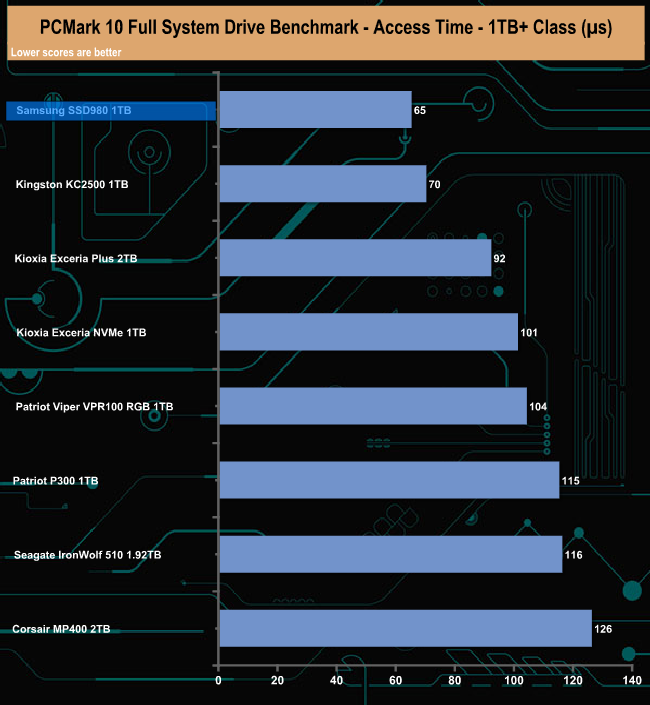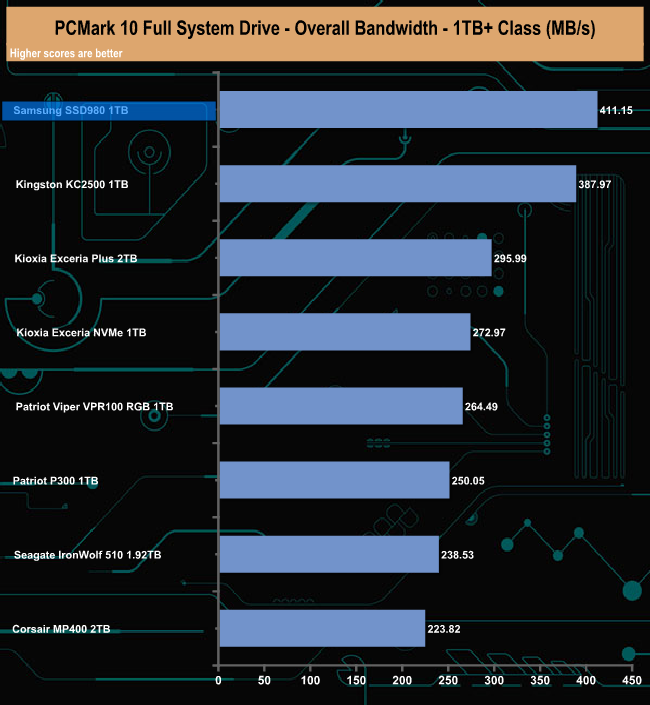 The SSD 980 is the fastest of the consumer PCIe Gen 3 drives we have tested with the PCMark10 Full System Drive benchmark to date.