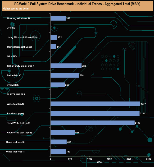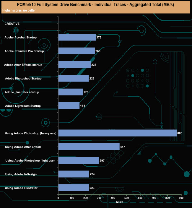 The PCMark 10 Full System Drive Benchmark uses a wide-ranging set of real-world traces from popular applications and common tasks to fully test the performance of the fastest modern drives. The benchmark is designed to measure the performance of fast system drives using the SATA bus at the low end and devices connected via PCI Express at the high end.