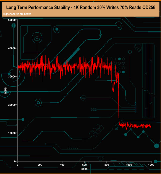 For the long term performance stability test, we set the drive up to run a 20-minute 4K random test with a 30% write, 70% read split, at a Queue Depth of 256 over the entire disk. The 1TB Samsung SSD 980 averaged 28,123.63 IOPS for the test with a performance stability of 76% which is very good for this class of drive.