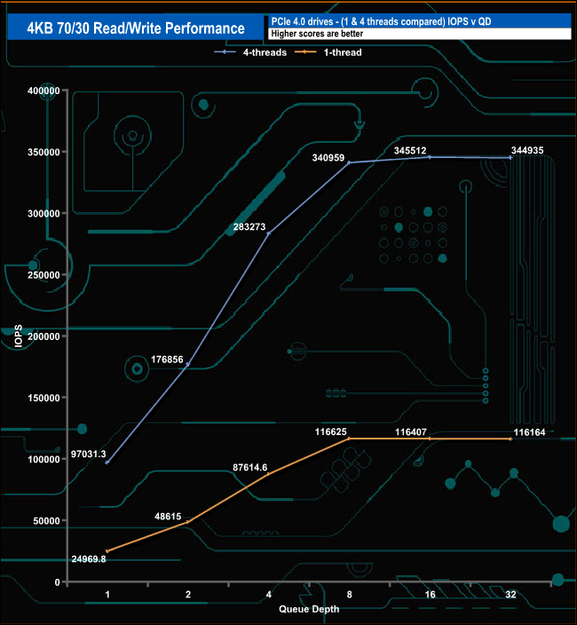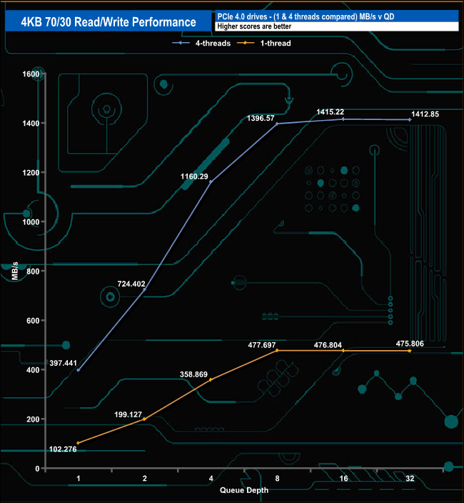 We used CrystalDiskMark 8’s custom settings to test the 4K 70/30 mixed read/write performance of the drive through a range of queue depths using a single thread and four threads.