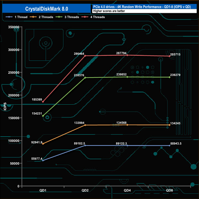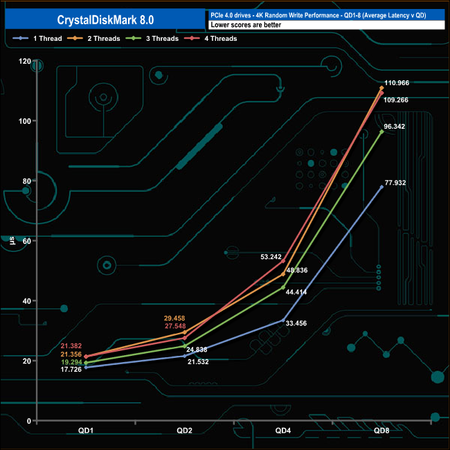 We used CrystalDiskMark 8 to test the random performance of the drive at lower queue depths (QD1 – QD8 where most of the everyday workloads occur) using 1 to 4 threads.