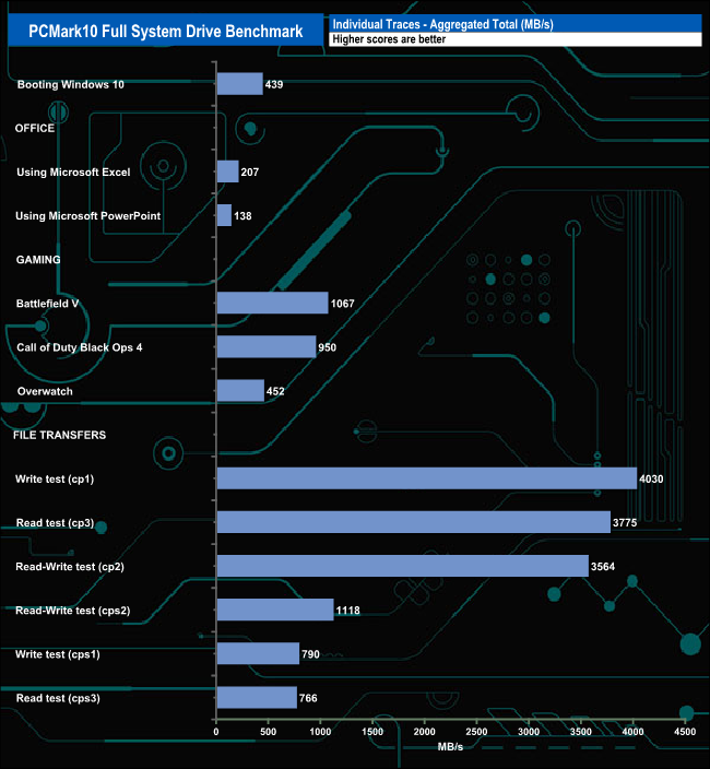 When it came to the three gaming test traces the drive averaged 823MB/s with the fastest being Battlefield V at 1,067MB/s and the slowest, Overwatch at 452MB/s. Call Of Duty Black Ops 4 was in the middle of these two at 950MB/s. Switching over to the file transfer tests the drive averaged 2,348.83MB/s for the six tests, the fastest of which was the cp1 Write test at 4,030MB/s.