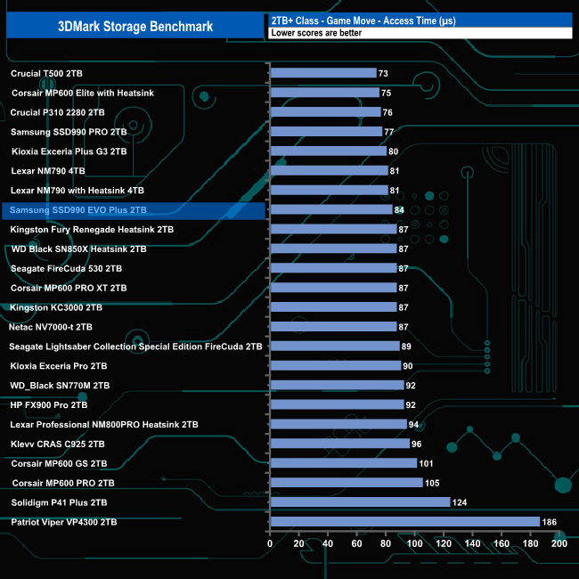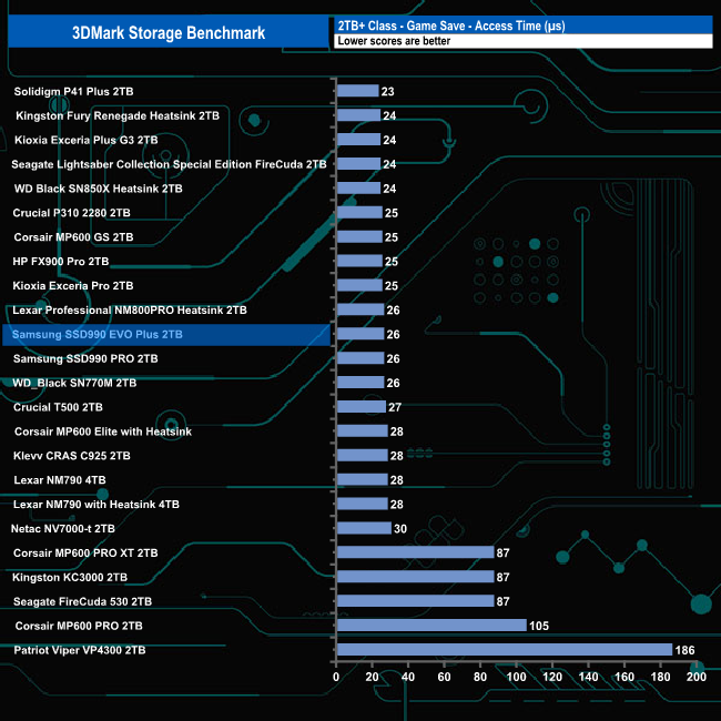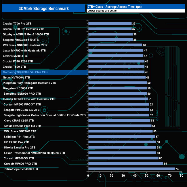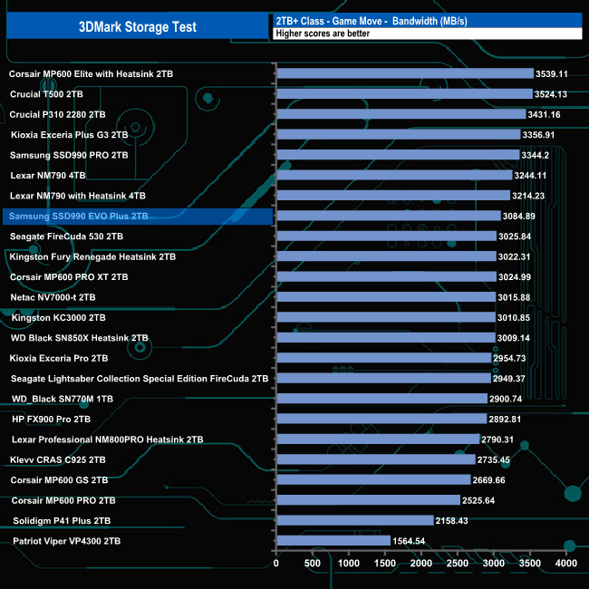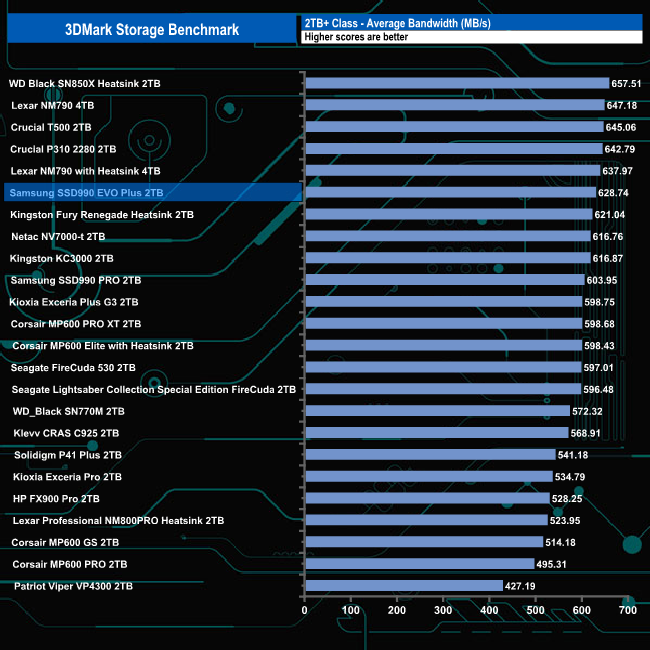 Samsung's 2TB SSD990 EVO Plus does well overall in the 3DMark Storage Benchmark with an average bandwidth figure of 628.74MB/s, which is good enough for sixth place in the results chart.