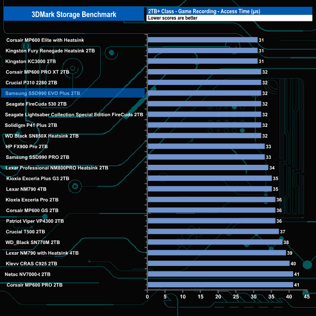 In the Game Recording test, the SSD990 EVO Plus finished a few places higher in the results table than the older SSD990 PRO drive.