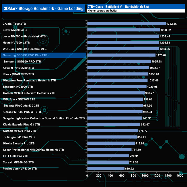 The SSD990 EVO Plus did well in the Battlefield V test. Its test result of 1,175MB/s was 80MB/s faster than that of the PRO version of the SSD990.