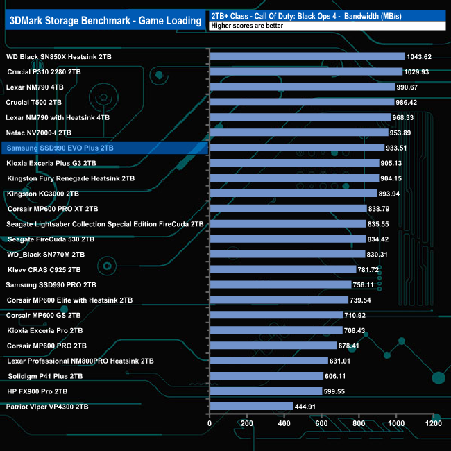 The drive slipped into seventh place on the results chart for the Call Of Duty: Black Ops 4 test with a test result figure of 933.51MB/s, 237.4 MB/s faster than the SSD990 PRO.