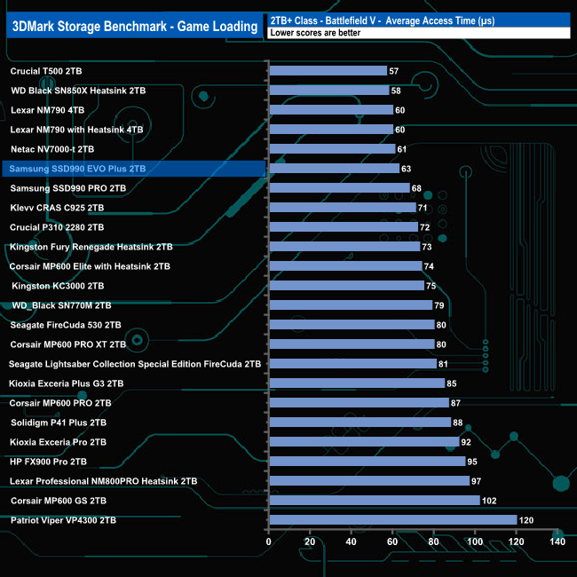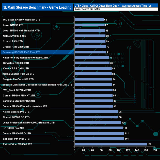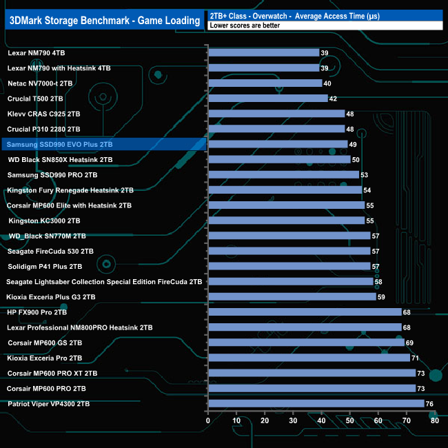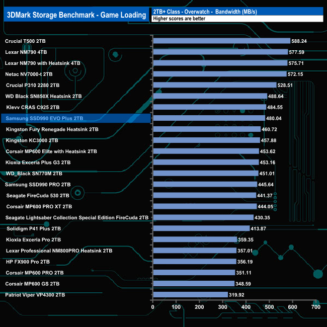 In the Overwatch game loading test, the SSD990 EVO Plus test result of 480MB/s sees it just inside the top ten of drives we have tested to date with this test.