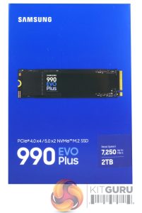 Samsung’s 990 EVO Plus comes in a compact box with a clear image of the drive on the front. On the bottom right-hand side of the box, we find a sticker displaying the drive’s 2TB capacity. Also displayed is the drive's 7,250MB/s Sequential read speed.