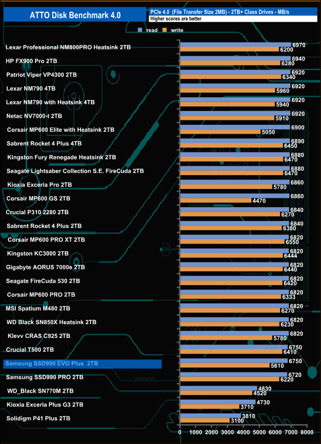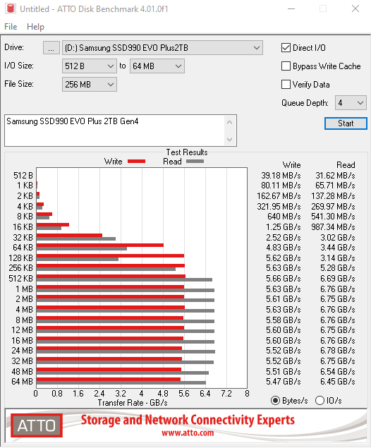 Using the ATTO benchmark we fell short of the official maximum Sequential read/write scores of up to 7,250MB/s and up to 6,300MB/s respectively for the drive with test figures of 6,750MB/s for reads and 5,610MB/s for writes.
