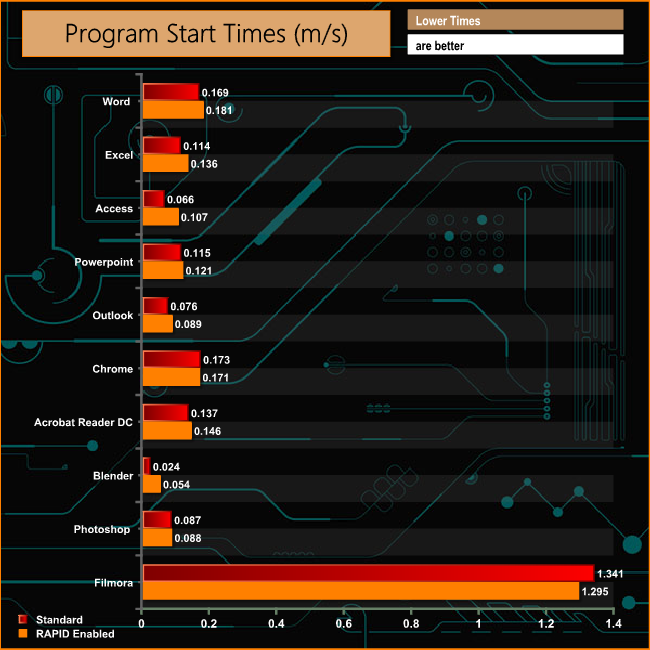 RAPID mode cache uses software that loads after the OS – the technology has no effect on boot up times and when it came to program loading times it was actually slower than the standard drive, with the exception of Wondershare Filmora … but we are talking milliseconds so it is actually not noticeable at all.