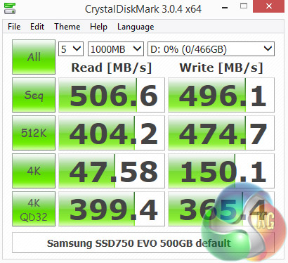 The SSD750 has support for Samsung RAPID (Real-time Accelerated Processing of I/O Data) technology. The RAPID technology takes a chunk of system memory and uses it as a high-speed cache. Samsung says RAPID mode is used primarily to accelerate read performance but for many benchmarks, it dramatically improves both read and write scores as can be seen by the benchmark results below.