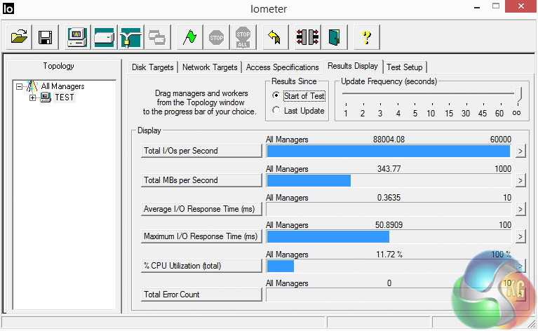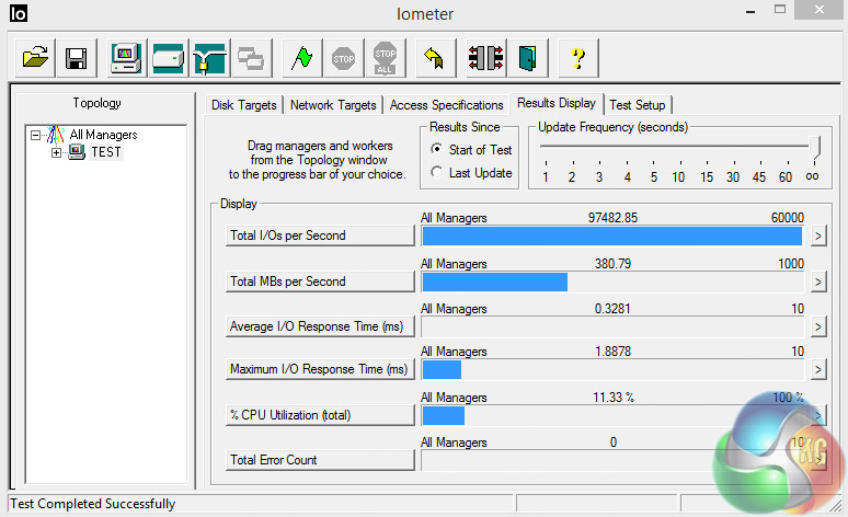 The interesting thing in the IOMeter 4K random read/write tests is that both reads and writes get the same sort of boost with the RAPID mode. The reads rise boosts the performance from 97,482 IOPS to 103,989 IOPS while the random 4K writes, rise from 82,787 IOPS to 88,004 IOPS.