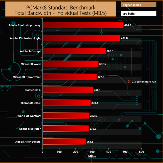 Just like the Consistency test, PCMark 8’s standard Storage test also saves a large amount of performance data. The default test runs through the test suite of 10 applications three times. Here we show the total bandwidth performance for each of the individual test suites for the third and final benchmark run.