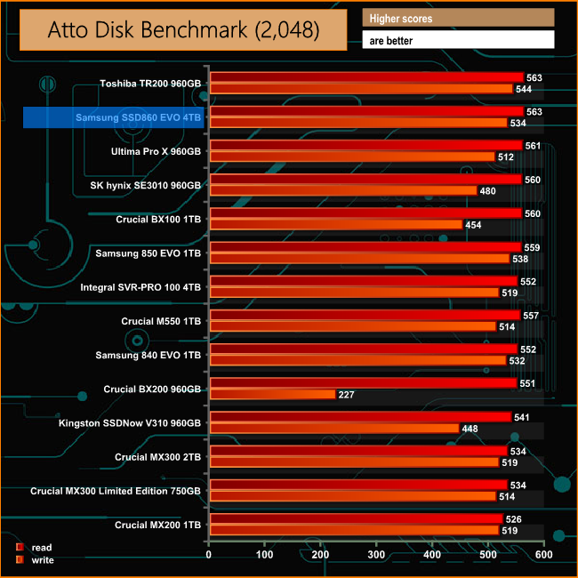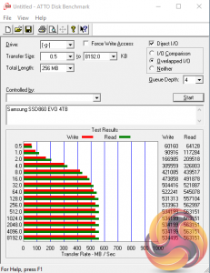 Samsung's official Sequential read/write figures for the 860EVO are 550MB/s and 520MB/s respectively. Using the ATTO benchmark we could confirm these figures and even get a little better, the tested drive producing a read score of 563MB/s with writes at 534MB/s.