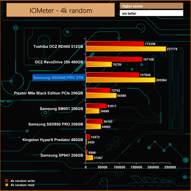 The IOMeter IOPS results aren’t near the specification performance because a different test procedure is used to the one that gives Samsung its specified figures. IOPS numbers can change quite significantly based on the tested QD and number of Threads.