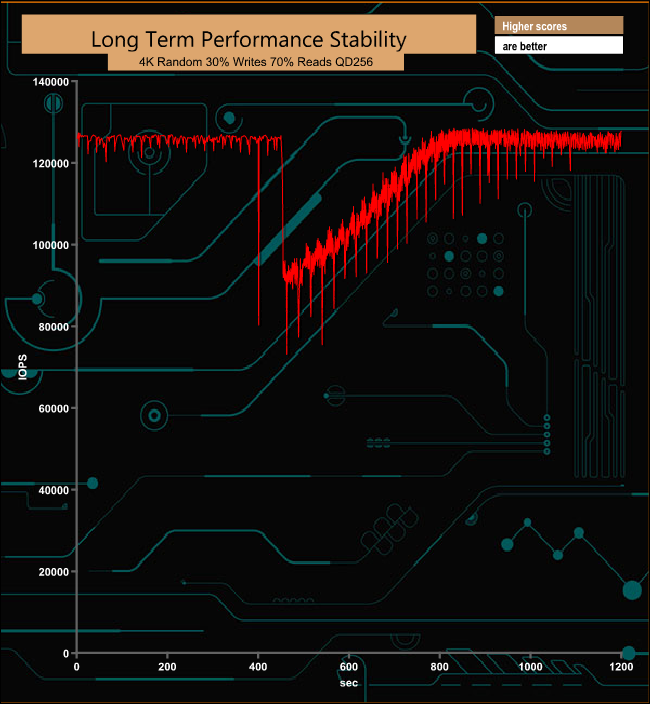 For the long term performance stability test, we set the drive up to run a 20-minute 4K random test with a 30% write, 70% read split, at a Queue Depth of 256 over the entire disk. The Samsung SSD980 PRO 1TB averaged 120,139 IOPS for the test with a performance stability of 93.6% which is excellent for a consumer drive.