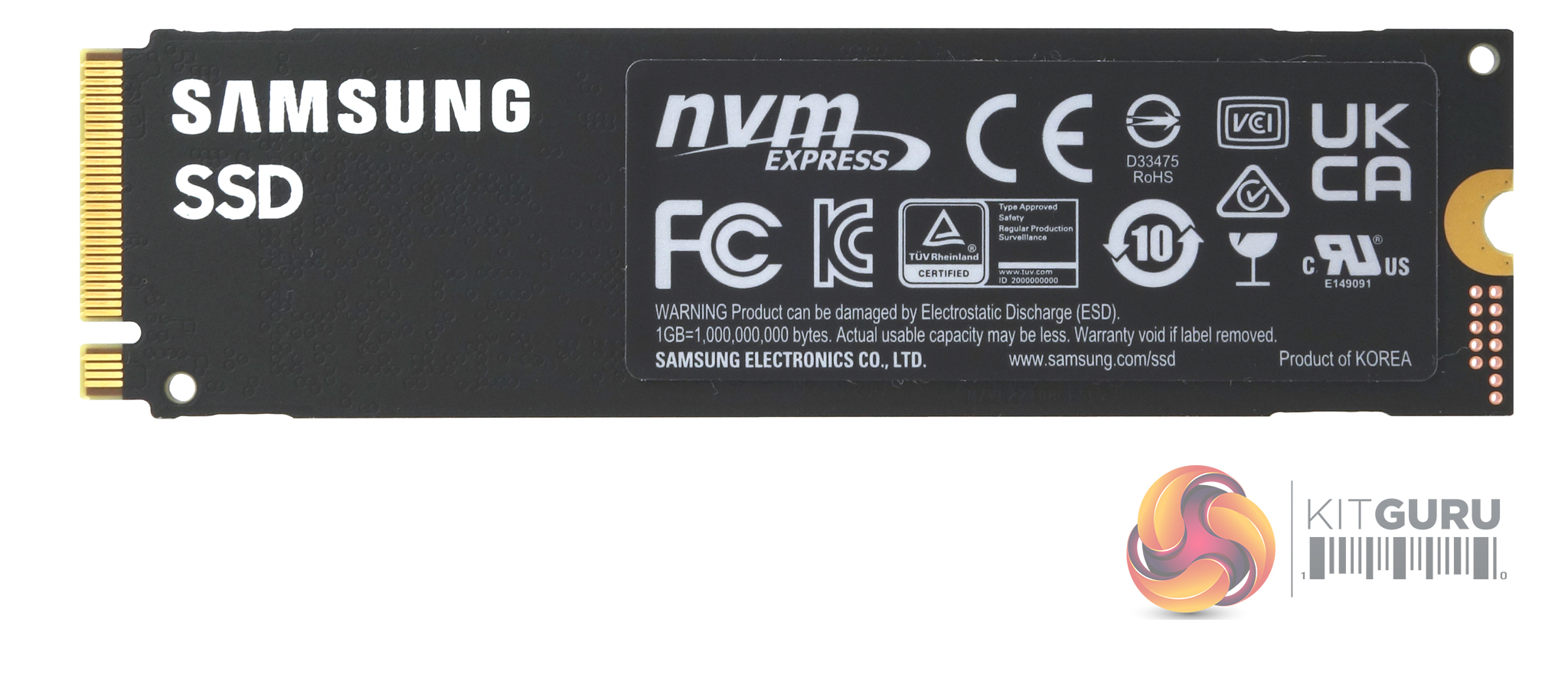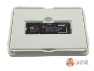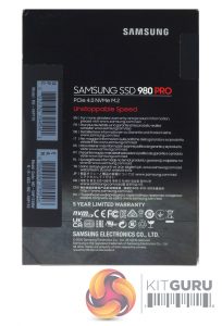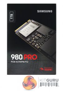 Samsung’s SSD980 PRO comes in a black box with a large image of the drive on the front. On the top left-hand side of the box, we find a sticker displaying the drive’s 1TB capacity. Also displayed is the fact that the drive uses a PCIe 4.0 interface and has a 7,000MB/s read speed.