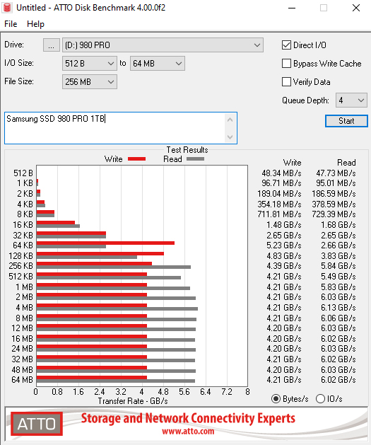 Using the ATTO benchmark we couldn't quite hit the top Sequential figures of 7,000MB/s and 5,000MB/s read and write respectively but the read result of 6,030MB/s with writes of 4,210MB/s make the SSD980 PRO the fastest PCIe Gen4 drive we've tested to date.