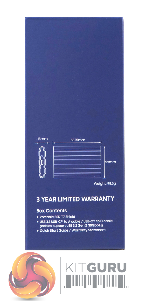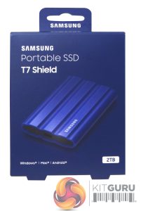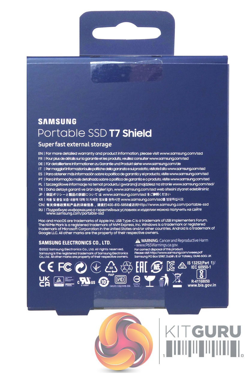 The T7 Shield comes in a small, chunky box. The front of the box has an image of the drive under which is a list of OS that the drive is compatible with; Windows, Mac and Android. To the right of this text is the capacity of the drive. The rear of the box has a multilingual address list for more warranty information.