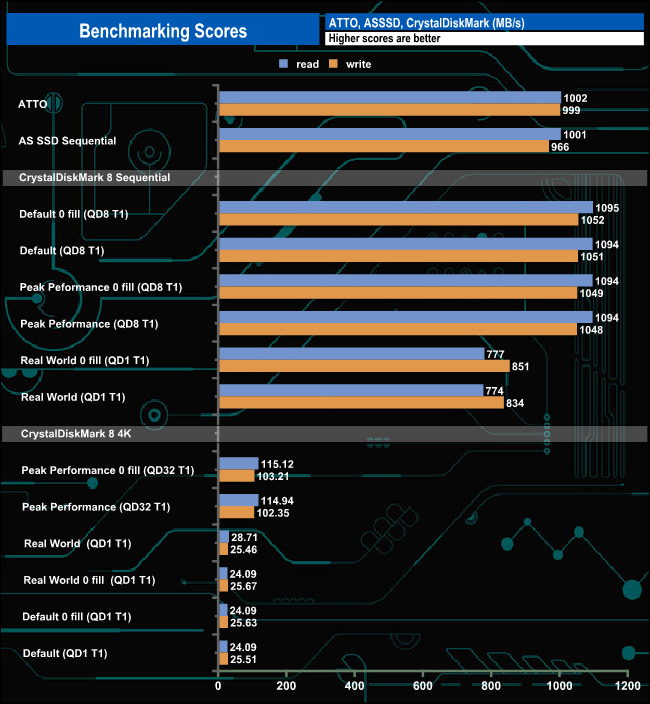 AS SSD is a great free tool designed just for benching Solid State Drives. It performs an array of sequential read and write tests, as well as random read and write tests with sequential access times over a portion of the drive. AS SSD includes a sub suite of benchmarks with various file pattern algorithms but this is difficult in trying to judge accurate performance figures.