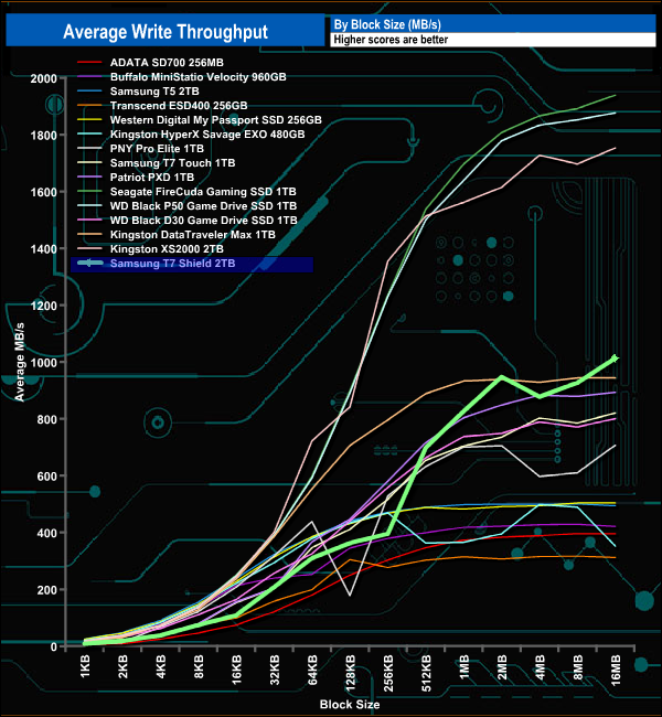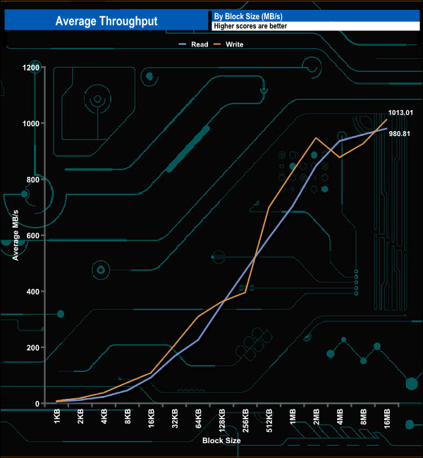 In our throughput tests, the peak average read performance came at the 16MB block mark at 980.81MB/s while the peak write figure of 1,013MB/s also came at the end of the test run at the 16MB block mark.