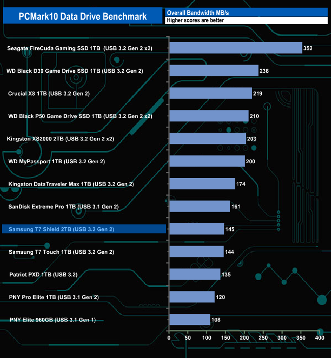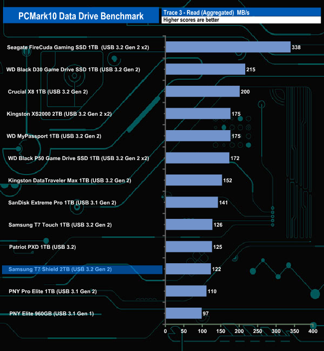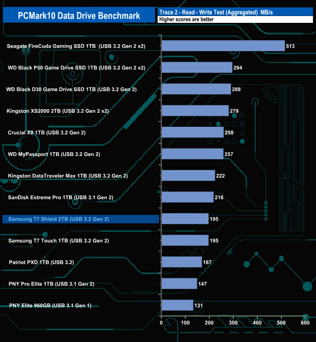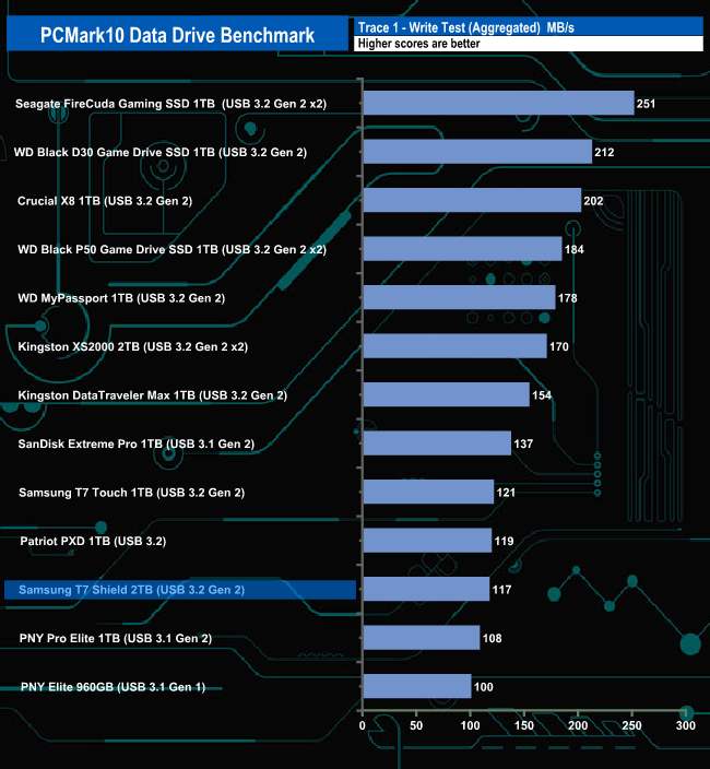 The Samsung T7 Shield doesn't seem to handle the PCMark10 Data Drive Benchmark test too well, sitting in the lower half of the results chart for all three trace tests.