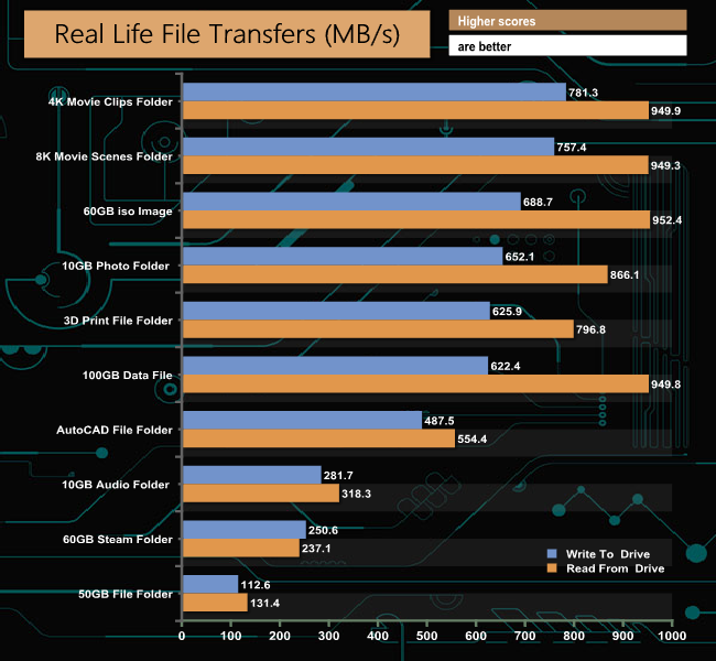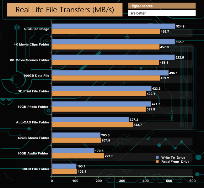 To get a measure of how much faster PCIe NVMe drives are than standard SATA SSDs we use the same files but transfer to and from a 512GB Toshiba OCZ RD400.