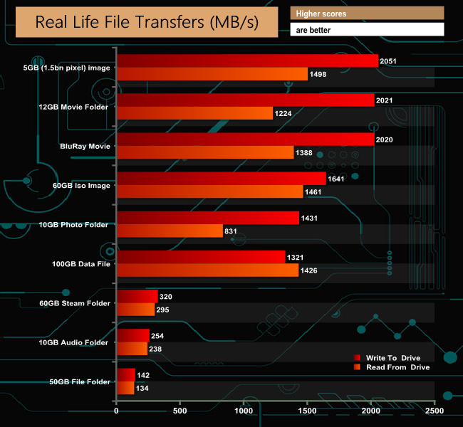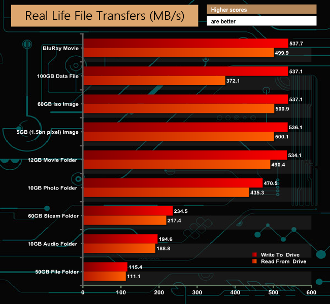 The X5 was much happier dealing with the larger file sizes of our real life transfer tests than the smaller file sizes of the 50GB File, 60GB Steam and 10GB Audio folders.