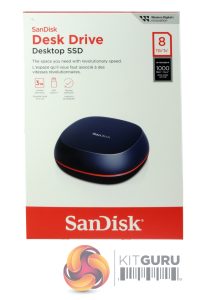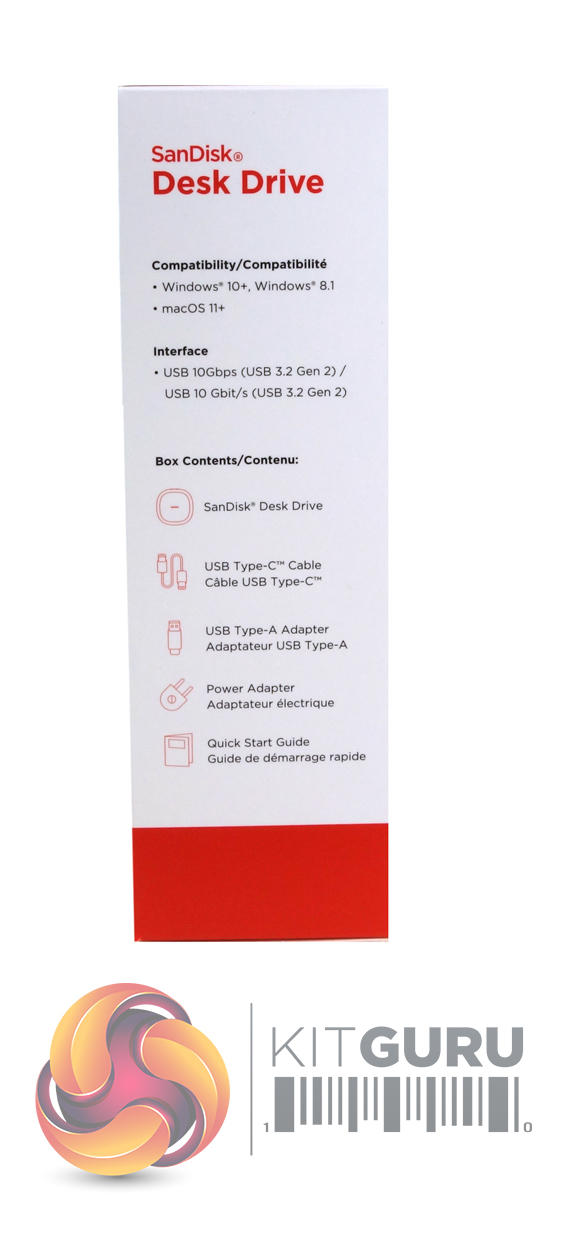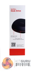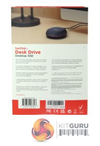 SanDisk's Desk Drive comes in a largish box with a good clear image of the drive itself on the front. Directly above this image and to the left are three icons (with both English and French labels) depicting; a 3-year warranty, the fact the drive uses a USB Type C interface and that it comes with backup software Top right of the box is where you'll find the drive's capacity under which is the read speed, once again both of these are labelled in English and French. The back of the box has some multi-lingual drive information.