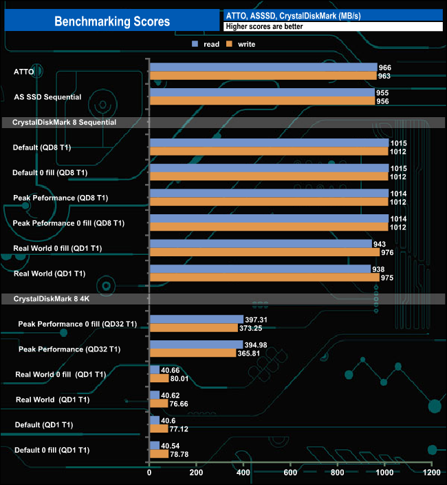 SanDisk quote read transfer speeds of up to 1,000MB/s for the Disk Drive but we couldn't find an official write figure on the spec sheet for the drive. Using the ATTO and AS SSD benchmarks the drive came up a little shy of the official read maximum with test results of 966MB/s and 955MB/s respectively. The best write figure saw for ATTO was 963MB/s while the best AS SSD figure was 956MB/s. Switching over to the CrystalDiskMark 8 benchmark the drive gave up a best-read score of 1,015MB/s (default and 0 fill tests) so confirming the official figure. The best write figure we saw was 1,012MB/s (four out of the six Sequential tests).