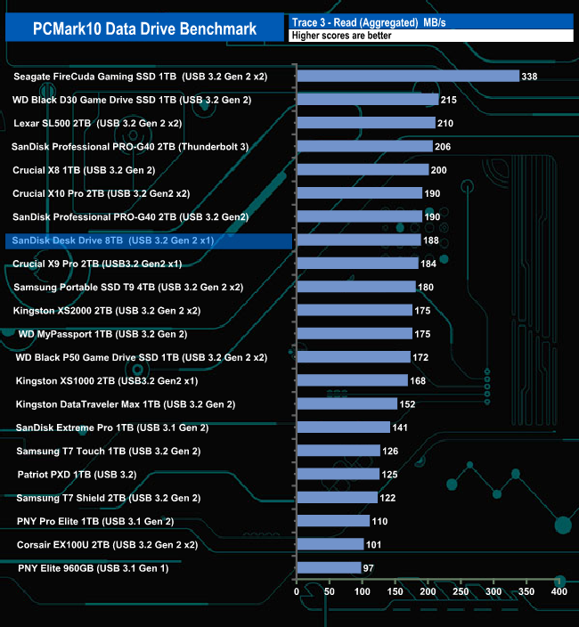 The 8TB Desk Drive handles the PCMark 10 Data Drive Benchmark well enough. It sits in the top 10 drives for all three parts of the benchmark run (Read-Write, Read and Write traces). It performs best by a very small margin in the Read-Write test. Its overall bandwidth result of 217MB/s sees the drive in sixth place on the results chart.
