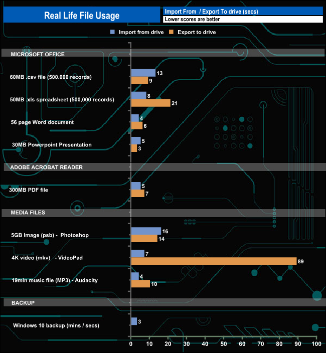 We also tested the time it took to import and export a mix of files from/to the Disk Drive into various programs.