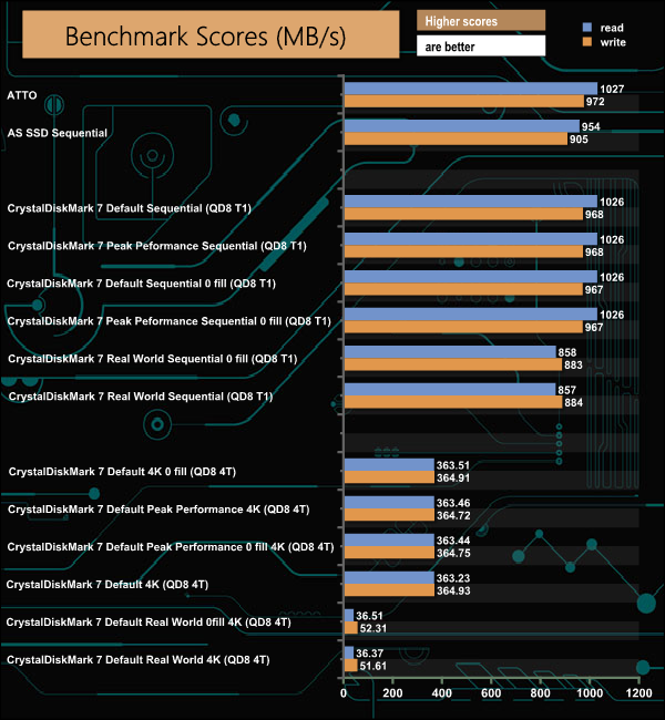 AS SSD is a great free tool designed just for benching Solid State Drives. It performs an array of sequential read and write tests, as well as random read and write tests with sequential access times over a portion of the drive. AS SSD includes a sub suite of benchmarks with various file pattern algorithms but this is difficult in trying to judge accurate performance figures.