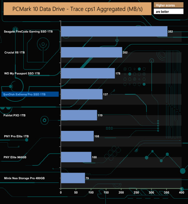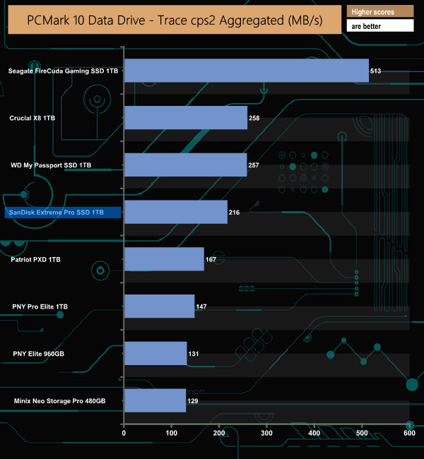 The SanDisk Extreme Pro SSD sits comfortably in mid-table for all three trace tests.